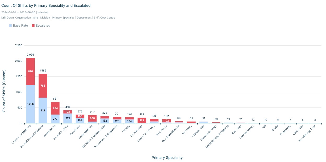 With the NHS continuing to face intense workforce pressures, managing staffing costs remains a major concern, with rising pay rate escalations cited as a major expense. Our research indicates that organisations are spending an average of £20 extra per hour per shift on rate escalations, with over 20% of all shifts being affected by these increases.