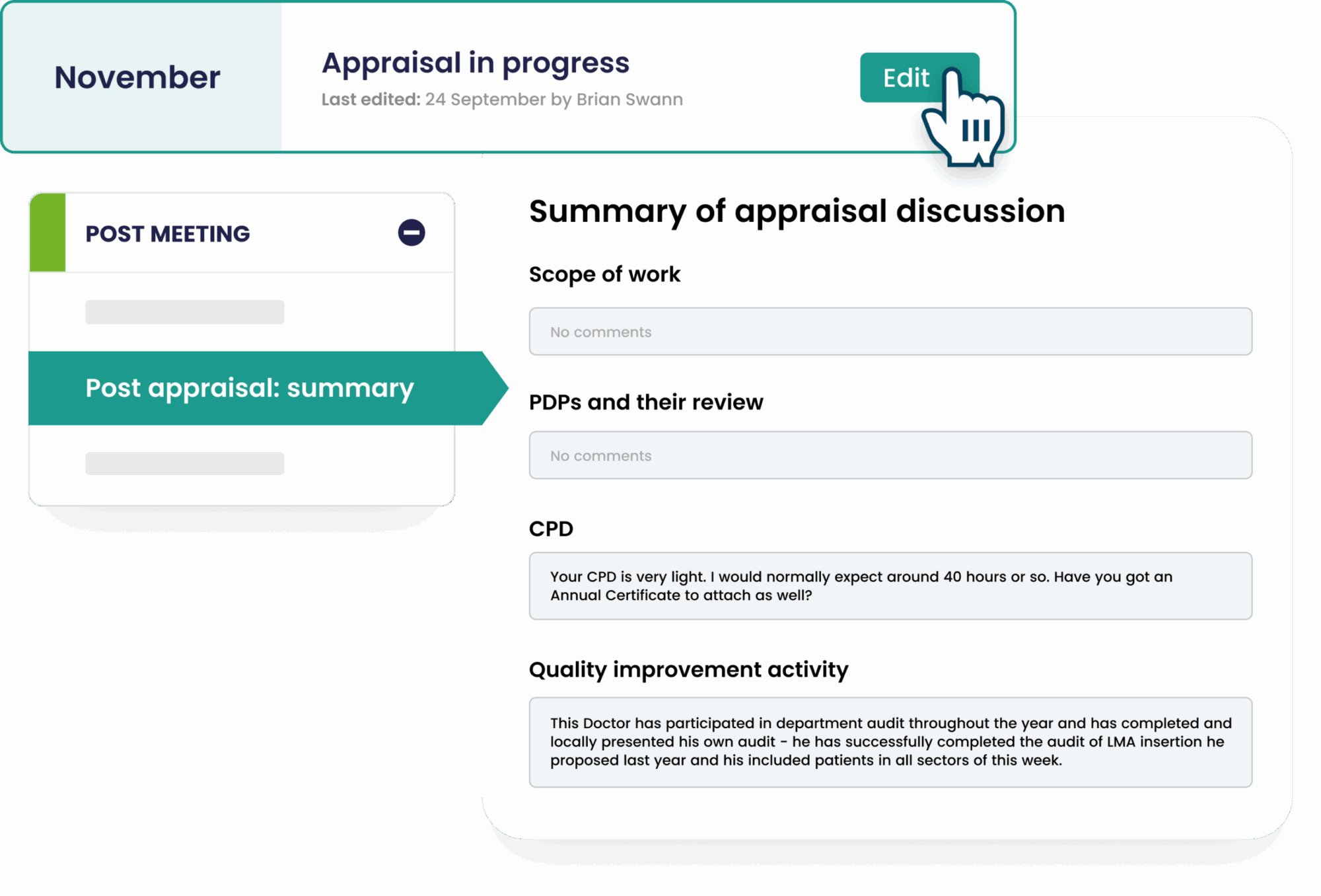 - Boost quality and reflection with a format that makes it easy for clinicians to submit thoughtful, structured appraisals.